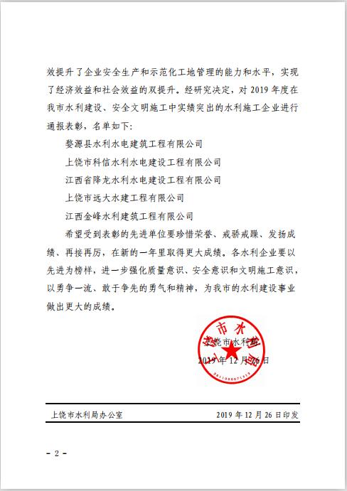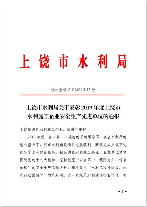 上饒市水利局關(guān)于表彰2019年度上饒市水利施工企業(yè)安全生產(chǎn)先進(jìn)單位的通報(bào)