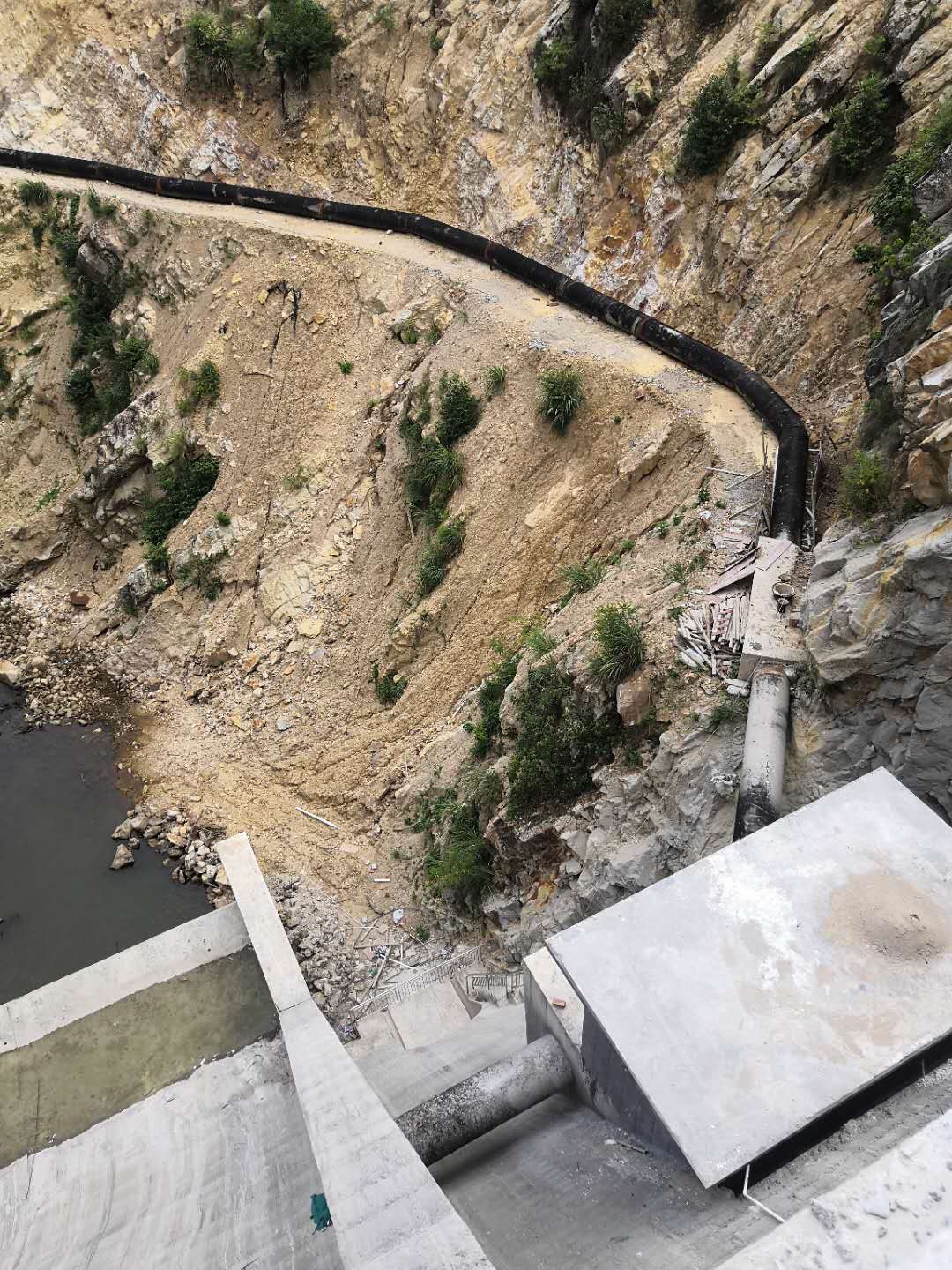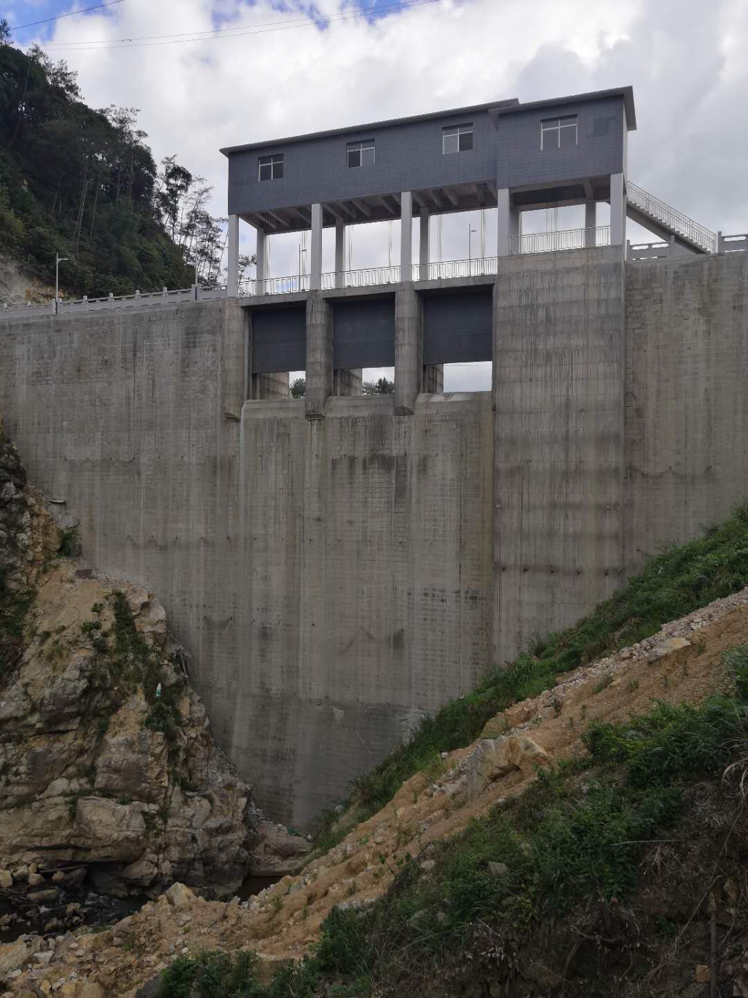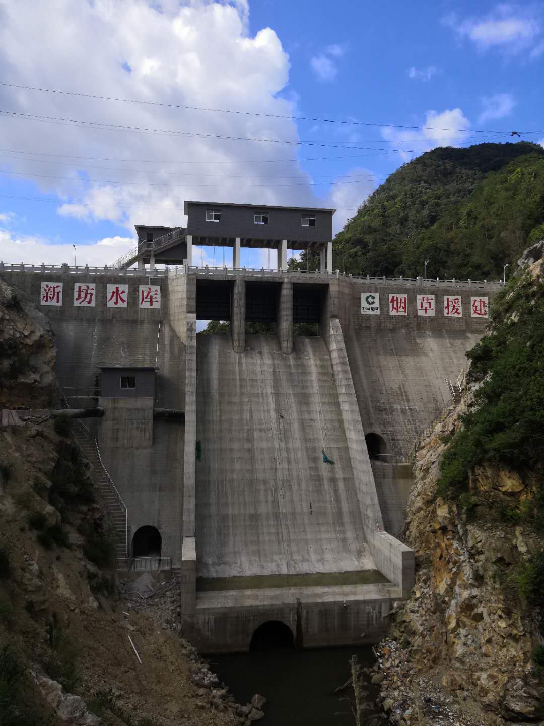 福建上杭新坊水庫大壩、啟閉機、供水管道、管理房。