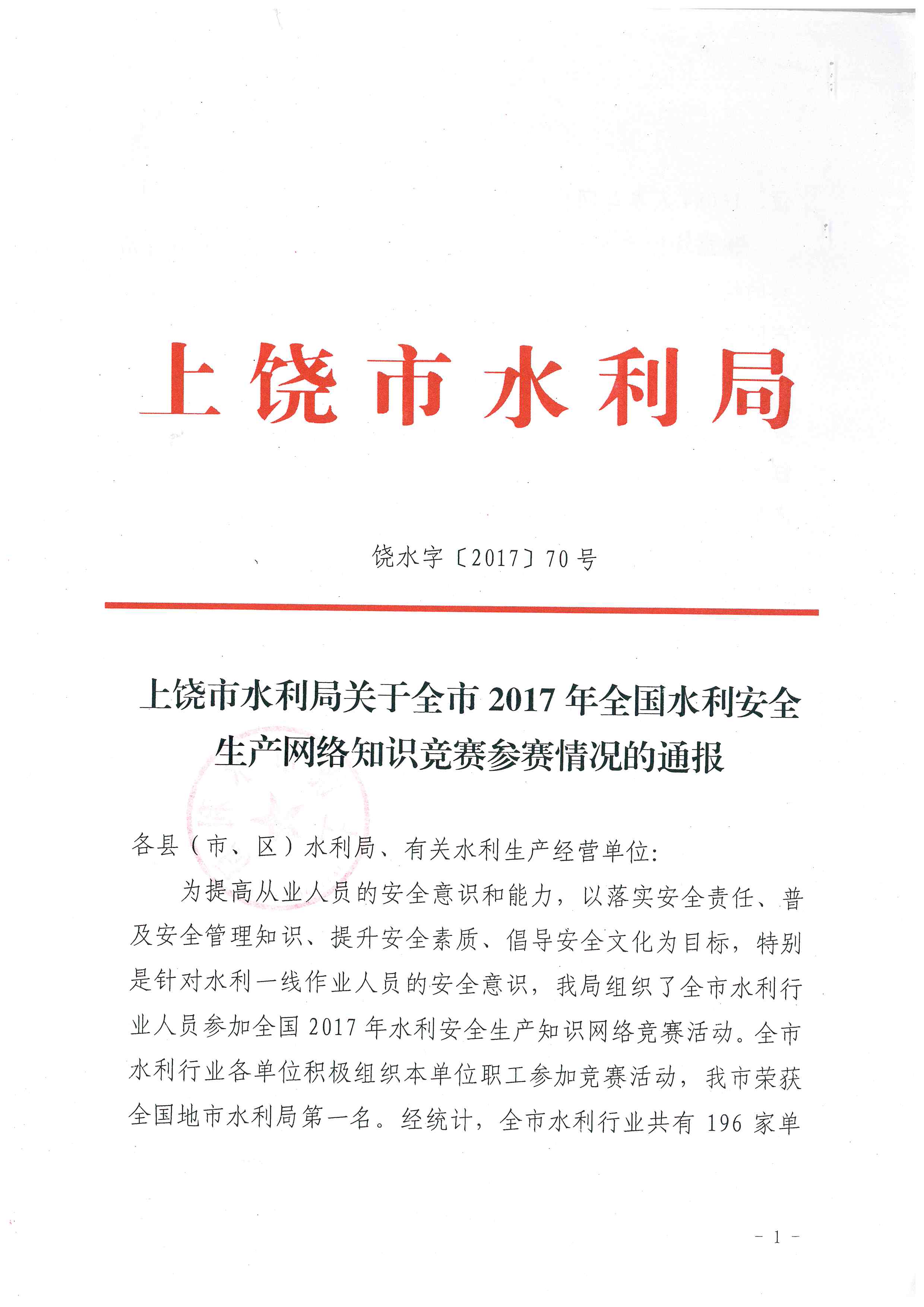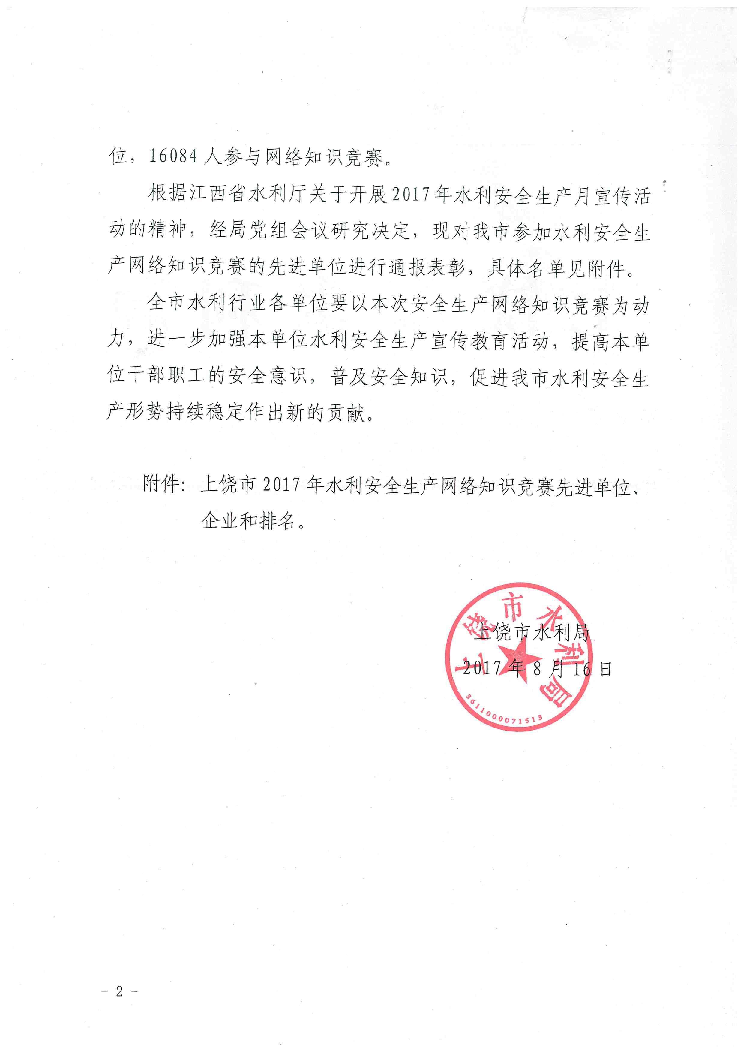 上饒市水利局關(guān)于全市2017年全國水利安全生產(chǎn)網(wǎng)絡(luò)知識競賽參賽情況的通報
