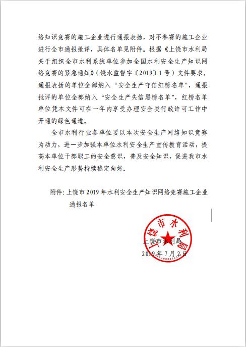 上饒市水利局關(guān)于全市2019年全國水利安全生產(chǎn)知識(shí)網(wǎng)絡(luò)競(jìng)賽參賽情況的通報(bào)