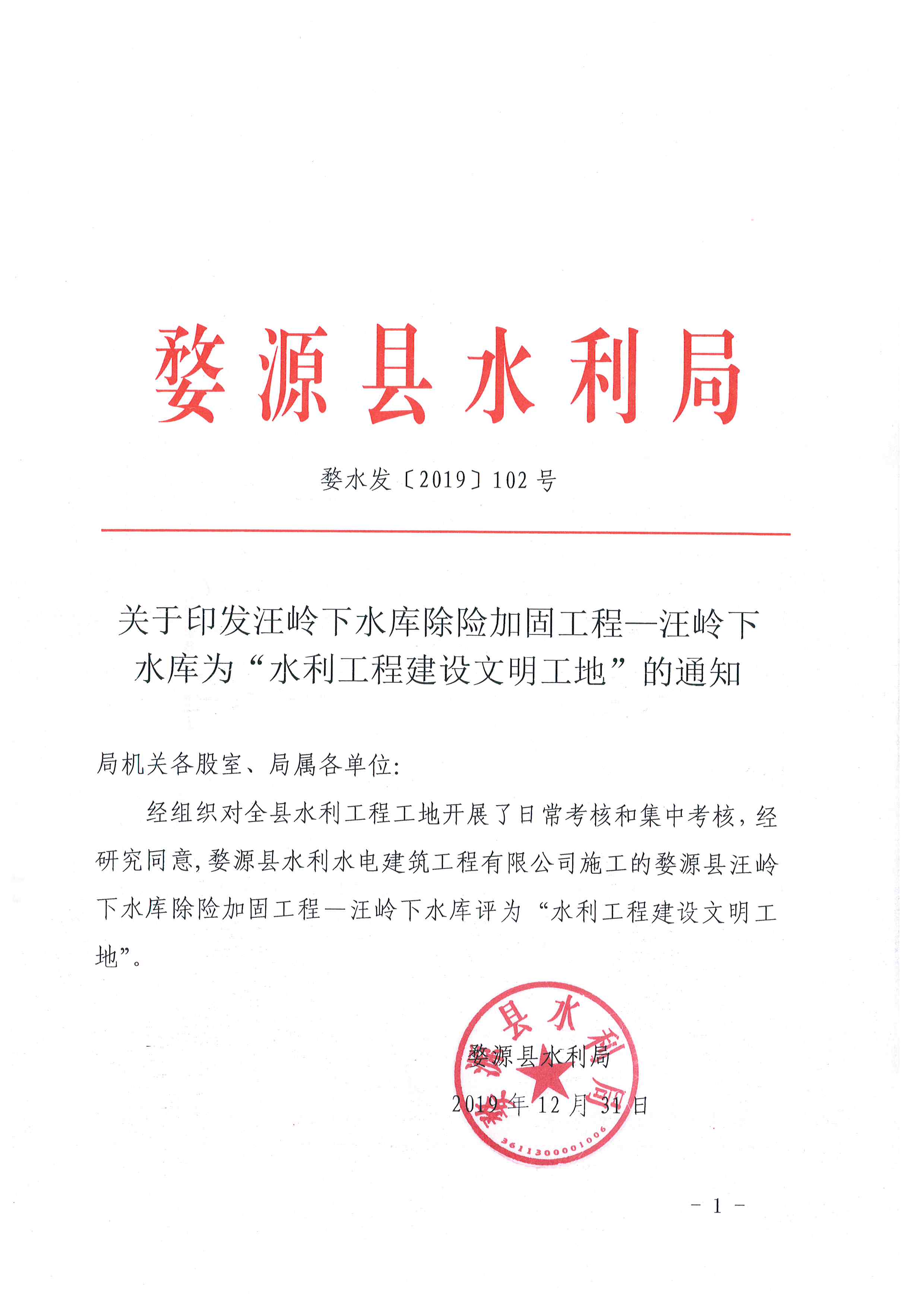關于印發(fā)汪嶺下水庫除險加固工程——汪嶺下水庫為“水利工程建設文明工地” 的通知